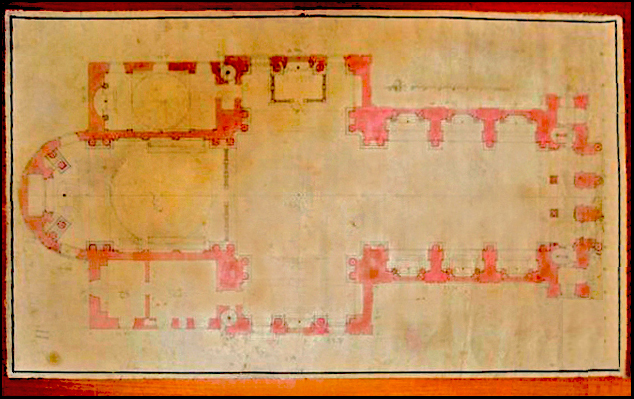 A very early Cruciform Floor Plan of the structural perimeter of the cathedral noted by walls in a reddish coloring. The key to enclosing such a large volume of space without any interior support was based on the mass of the perimeter walls and the many columns, plinths, arches, and the large structural wood members that tied the walls together. The interior arches within the cathedral also support and stabilize the weight and pressure of the roof structure and clay tiles above. (No flying buttresses outside).