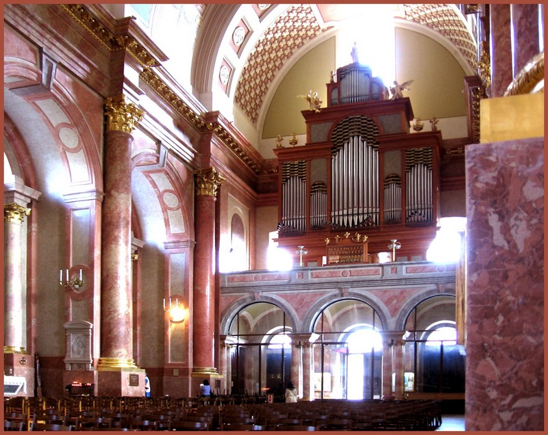 The story of the organ 1999: “The Aquincum Organ factory made the organ in Budapest. They used the pipes of the Sacred Heart church in Augsburg. These pipes where made by G.F. Steinmeyer and Cie (Ottingen) in 1915. In memory of the destroyed organ, the new imposing 12 meter tall redwood organ cabinet is decorated with statues found in the rubble after the bombing. Inside the organ the pipes are arranged on 4 levels. Some of the large pipes situated in the facade are 6 meters tall.