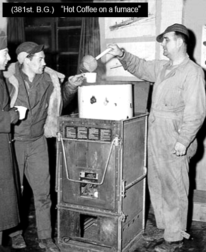[Photo] The 381st Bomb Group serves home brewed coffee - a cuppa-joe. [Photo] The 381st delivering mail at the camp. [Photo] The 460th Bomb Group at Sunday church services.