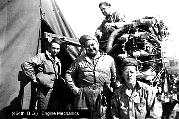 [Photo] The 381st Bombardment Group's engine repair shop. [Photo] 464th Bomb Group engine maintenance mechanics. [Photo] The 456th Bomb Group repairs a Norden bombsight.