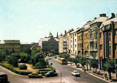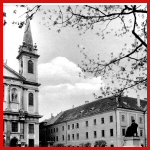 [Photo] A busy street scene from 1958 Szombathely. [Photo] Bishop János Szily Statue (First Bishop of Szombathely) in front of his Cathedral. [Photo] Roman ruins behind Szombathely Cathedral.