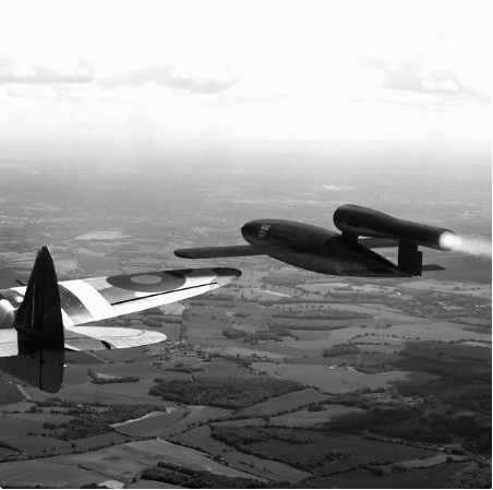 The V-1 was the first of the so-called "Vengeance weapons" series (V-weapons or Vergeltungswaffen) deployed for the terror bombing of London. It was developed at Peenemünde Army Research Center in 1939 by the Nazi GermanLuftwaffe at the beginning of the Second World War, and during initial development was known by the codename "Cherry Stone". Because of its limited range, the thousands of V-1 missiles launched into England were fired from launch facilities along the French (Pas-de-Calais) and Dutch coasts. The Wehrmacht first launched the V-1s against London on 13 June 1944, one week after (and prompted by) the successful Allied landings in France. At peak, more than one hundred V-1s a day were fired at south-east England, 9,521 in total, decreasing in number as sites were overrun until October 1944, when the last V-1 site in range of Britain was overrun by Allied forces. After this, the Germans directed V-1 at the port of Antwerp and at other targets in Belgium, launching a further 2,448 V-1s. The attacks stopped only a month before the war in Europe ended, when the last launch site in the Low Countries was overrun on 29 March 1945.